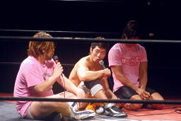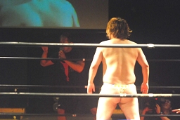 マイケル控室に戻らずに木曽レフェリーに「ちょっとバッターやってみて。」木曽レフェリーが空振りすると(右写真)「ストラ〜イプ!レフェリーのシャツの。」
