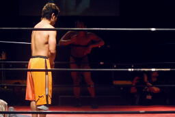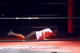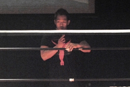 マイケル「ディーノ、今お前何つった?」ディーノ「ナイトメア?」マイケル「DJタイム!DJタイム!」と言いながらまた皿を回すマネ。ちょっと笑う人も出てきた。しかし新藤リングアナ「試合を続行します!」マイケル控室に戻る。(右写真)