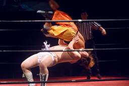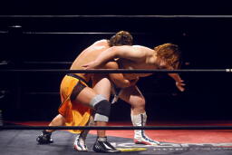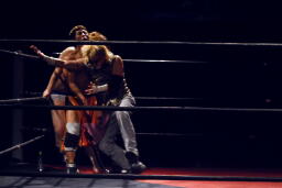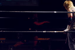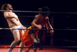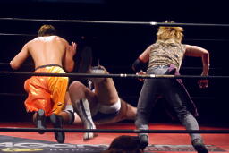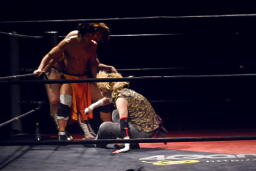 ニラにダブルのガットショット、ロープに振る、ニラはディーノをかわして高梨にロケットパンチ(左写真)。