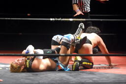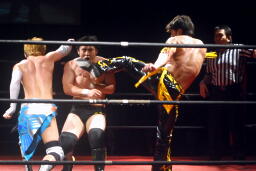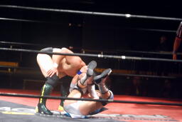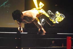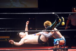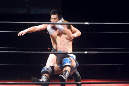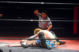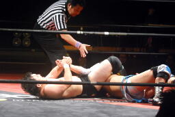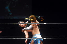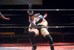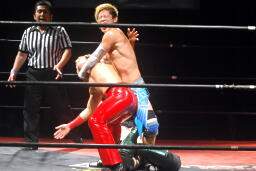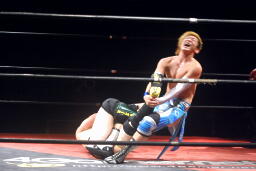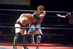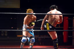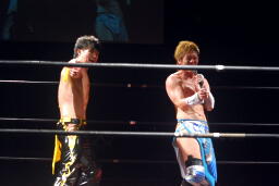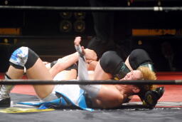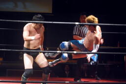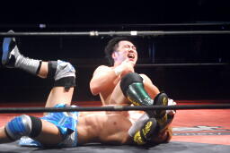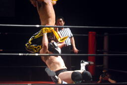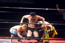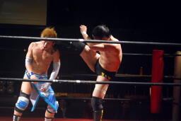 大石がカタプルパで佐藤を立たせ、KUDOがダイビングダブルニーアタック(右写真)。