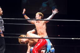 ダブルのニークラッシャー(左写真)、KUDOコーナーに上る。