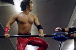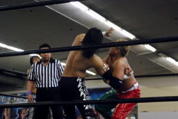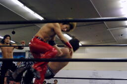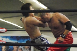 HARASHIMAガットショット、ヘッドロック。高尾がロープに振ってショルダーブロックの打ち合い、高尾が勝つ(右写真)。