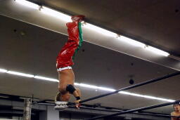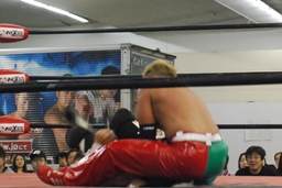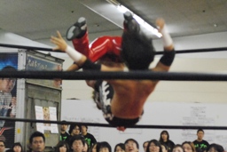 ロープに引っ掛かったところにもう一発ドロップキック(右写真)、カウント2。10分経過。