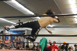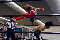 佐々木HARASHIMAを呼び込みダブルでコーナーに振って突っ込む、高尾かわして延髄蹴り。HARASHIMAロープに飛んでビッグブーツ、高尾2発目にカウンターのドロップキック(右写真)、斗猛矢にタッチ。