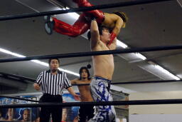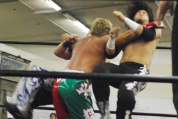 先発は佐々木と斗猛矢。ロックアップ、斗猛矢が腕を固める(右写真)。