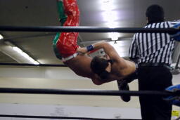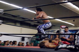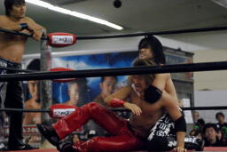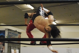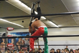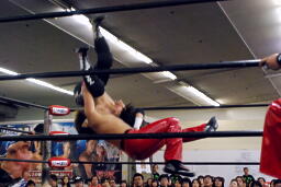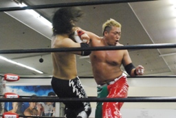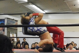 佐々木は高尾をコーナーに振って突っ込む、高尾ガットショットで止めてフラットライナーでターンバックルに(右写真)。背中にダブルニードロップ、カウント2。