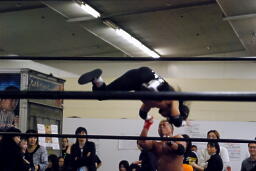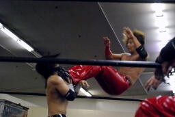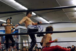 投げ落して下からヒザ蹴り(右写真)。ストンピング打ち込んで佐々木にタッチ。