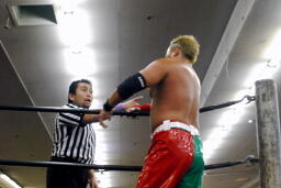 なんやかやとクレームを付ける斗猛矢に松井レフェリー「そんなに俺にかまって欲しいのか!」(右写真)HARASHIMAは佐々木にタッチ。