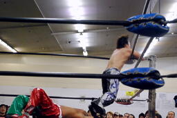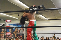 リングに戻すとDDT、コーナーに上ってダイビングエルボードロップ(右写真)、高尾がカット。
