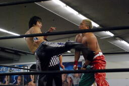 高尾エルボー連打、ロープに飛び乗って反転エルボー狙うが佐々木はドロップキック(左写真)。