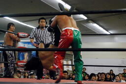 佐々木パンチ、ロープに振ってドロップキック(左写真)、カウント2。5分経過。