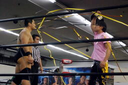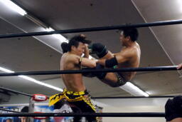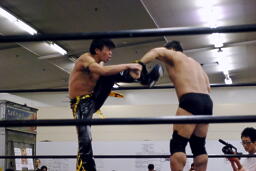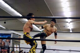 エルボーの打ち合い、KUDOミドルキック、首投げからサッカーボールキック(左写真)、カウント2。