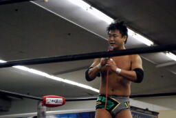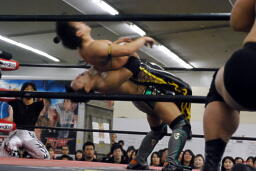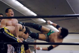 MIKAMIが澤にデュランダル、KUDOがコーナーからダイビングニーアタック狙うが澤かわしローキック(左写真)。