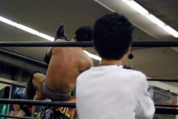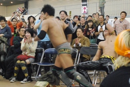 KUDOが澤を客席に座らせて逆水平、澤逆にKUDOを座らせるとダッシュ(右写真)。