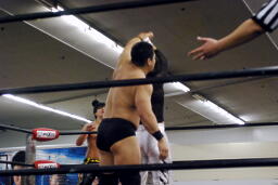 肩車からシットダウンひまわりボム(右写真)、カウント3。
