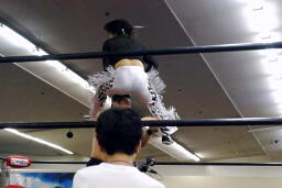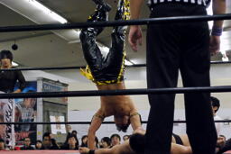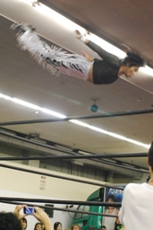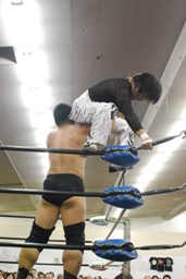 MIKAMIが入るが澤は2人まとめてドラゴンスクリュー。変態大社長コンビコーナーに上って「黄金シャワー!」(右写真)しかしKUDOにロープを揺らされると落下、今日もまたこの技は日の目を見ず。