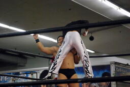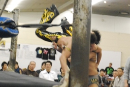MIKAMI背中を向けてコーナーに上る、高木が捕まえる(左写真)。