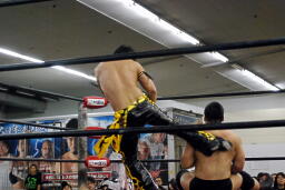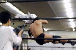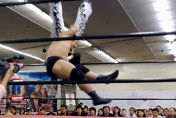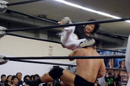 ダブルでコーナーに振ってKUDOが8×4、MIKAMIスライディングで場外に出て足を引っ張る。うつぶせに倒れた高木にトップロープ越しのトペ・アトミコ(右写真)。KUDOダブルニーアタック、MIKAMIがブーメラン、KUDOカバー、カウント2。