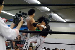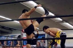 MIKAMI高木をコーナーに振ってジャンピングハイキック(右写真)。
