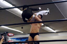KUDOネックロック、澤腕を取って切り返す、KUDO返す(右写真)、KUDOヘッドロックからフライングメイヤー、澤ヘッドシザーズでブレーク。