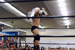 コーナーに上ってスワントーンボム(右写真)、カウント2。10分経過。