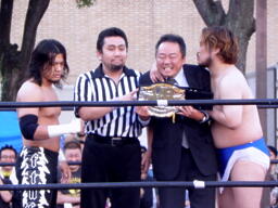 コーナーでベルトを掲げる(左写真)。