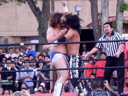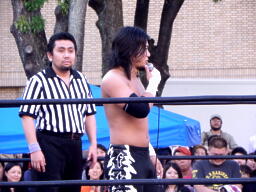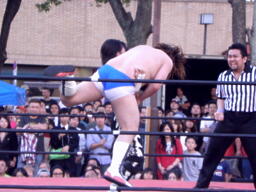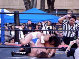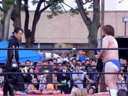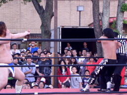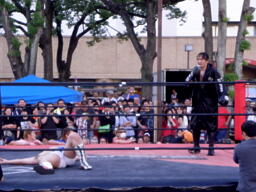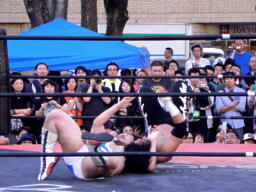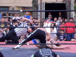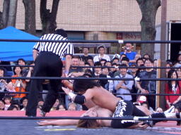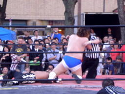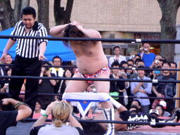 ディーノパイプカッター、男色ドライバー狙う、佐々木はスクールボーイ(右写真)、意識を取り戻した松井レフェリーがカウント、2。