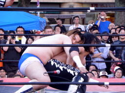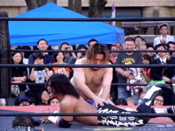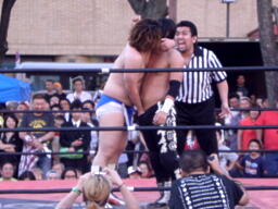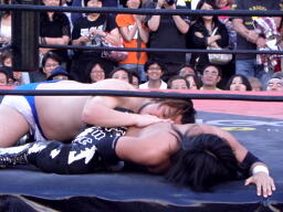 佐々木ウラカンホイップ(左写真)からカバー、カウント2。5分経過。