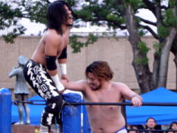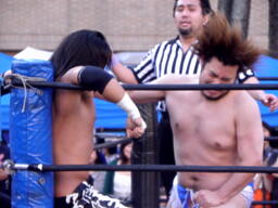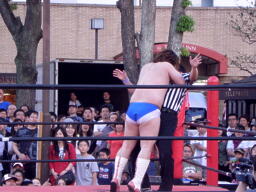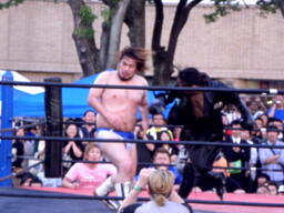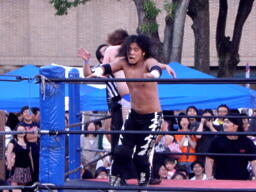 ディーノコーナーに上る、佐々木はロープにぶつかって揺らす、ディーノバランス崩し(左写真)股間をクロッチ。ロープに引っ掛かった状態のディーノに佐々木はドロップキック。