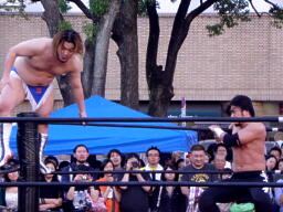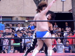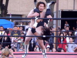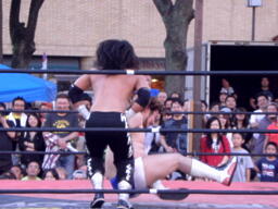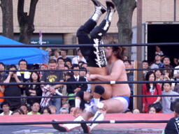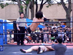 佐々木コーナーに上ってダイビングクロスボディ(右写真)。