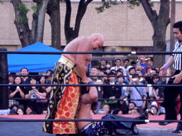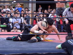 先発はKUDOとウラノ。首の取り合いからKUDOがヘッドロック。ウラノバック取る、KUDO切り返す、ウラノ腕取って切り返す。KUDOまた切り返す、ウラノ足をすくってレッグロック(左写真)。ウラノ腕を固めてアントンにタッチ。KUDOもHERO!にタッチ。