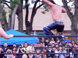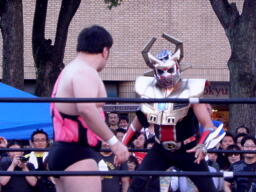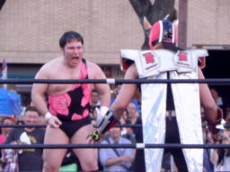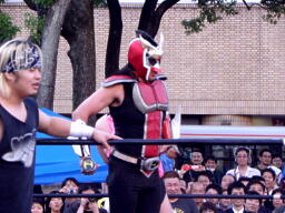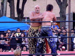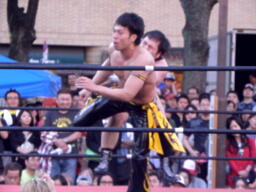 バックの取り合いから急所蹴り合戦(左写真)。HERO!もう一発急所打ち、HARASHIMAにタッチ。