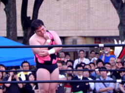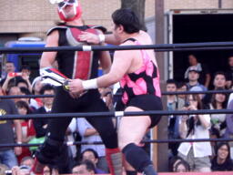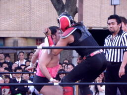 HARASHIMAガットショットからヘッドロック、星誕期ロープに振ってショルダーブロックの打ち合い(左写真)、星誕期倒してストンピング。