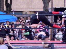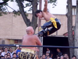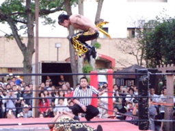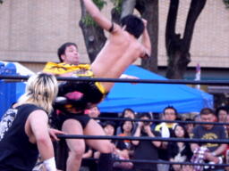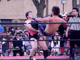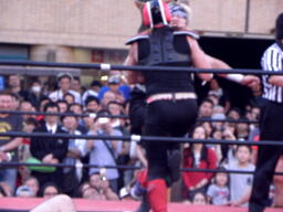 HARASHIMAミドルキック、エプロンに出てスワンダイブプレス(左写真)、KUDOにタッチ。ウラノ延髄蹴り、星誕期にタッチ。