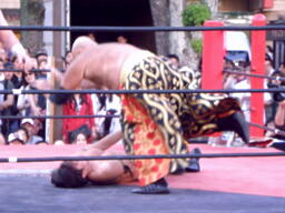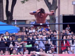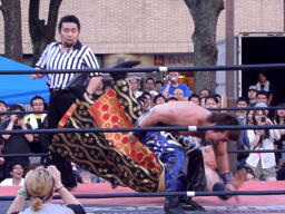 HARASHIMA「ウータン!」と叫んでミサイルキック(右写真)。15分経過。