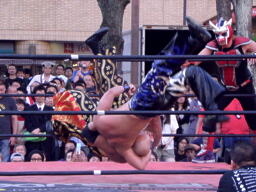 HERO!とHARASHIMAはアントンとウラノにダブルのプランチャ(左写真)。
