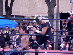 ウラノ耳元で大声、首投げからサッカーボールキック(右写真)、カウント2。アントンにタッチ。