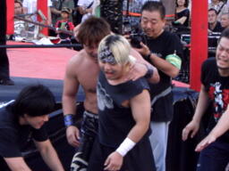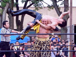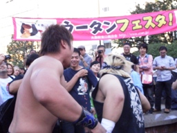 HARASHIMAボディスラム狙う、星誕期ブロックしてブレーンバスター(左写真)、ウラノにタッチ。5分経過。