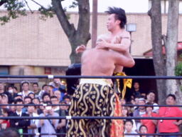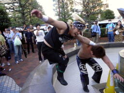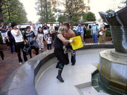 縁での打ち合いから両者噴水に転落!しかし水は張ってなかった(右写真)。省エネの都合らしい。