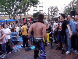 客席に(左写真)。ウラノ「手の鳴る方に」とばかりにHARASHIMAを誘導し挑発。