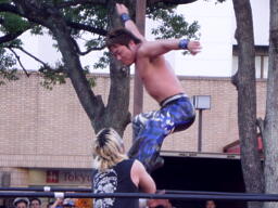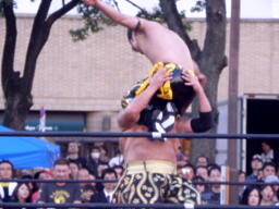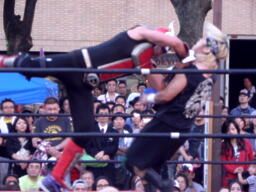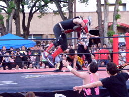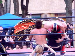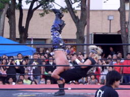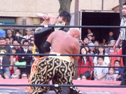 星誕期ラリアット、カウント2。アルゼンチンバックブリーカー(右写真)、HERO!がカット。