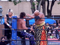 首投げから顔面ひねり(左写真)。リリースしてボディプレス。ウラノにタッチ、アントンもリングイン。10分経過。