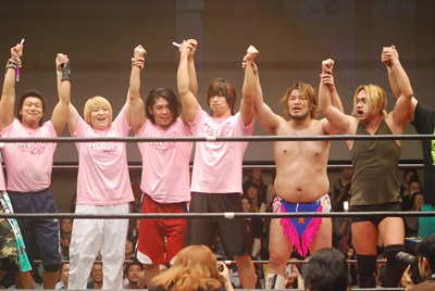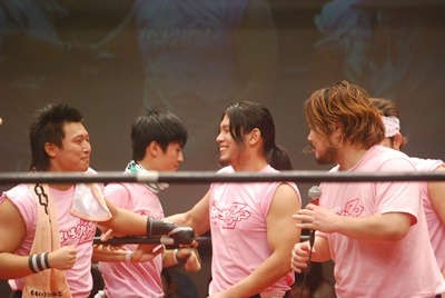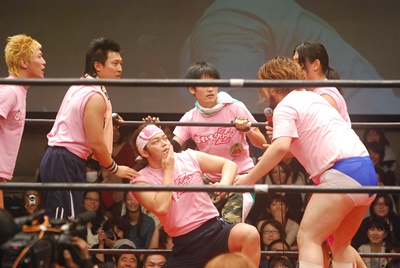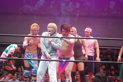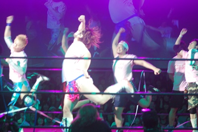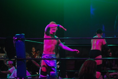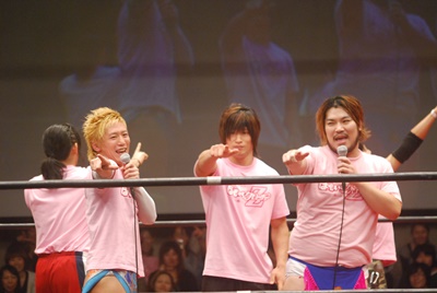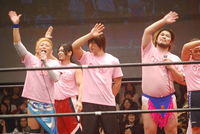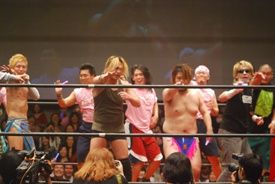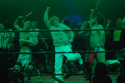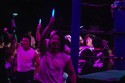 ほもクロのランバー達はサイリウム持ってリングサイドで踊る(右写真)。ニラ、入江も参加。