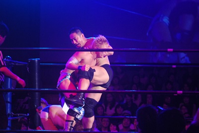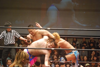 2人をコーナーに振るとまとめて担ぎ、落とす(左写真)カバーはカウント2。5分経過。