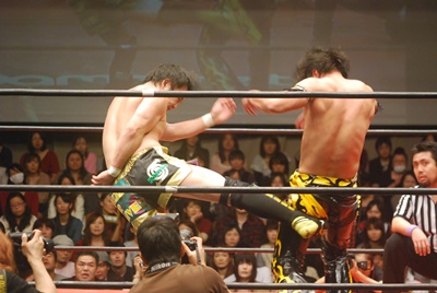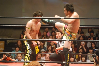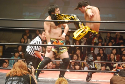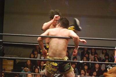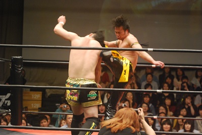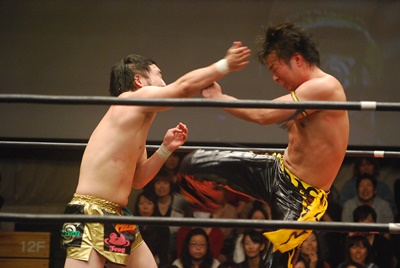 佐藤ヘッドバット(左写真)、KUDOも返し打ち合いに。