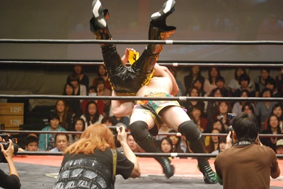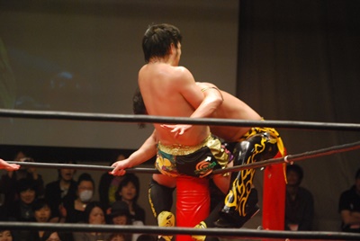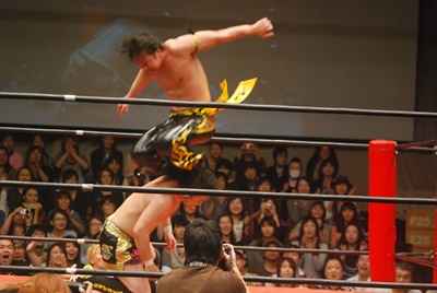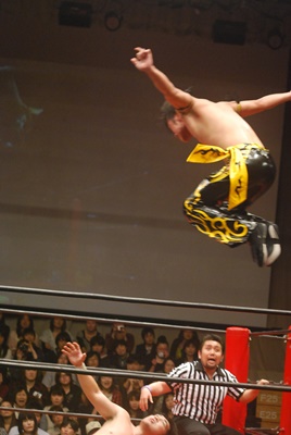 再度コーナーに上ると立ち上がりかけた佐藤に延髄ニードロップ(右写真)、カウント2。