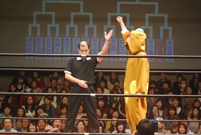一回戦。まずは着ぐるみを着た大石が不戦勝の勝ち名乗りを受ける(左写真)。