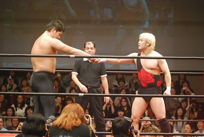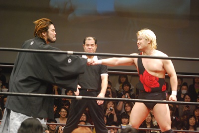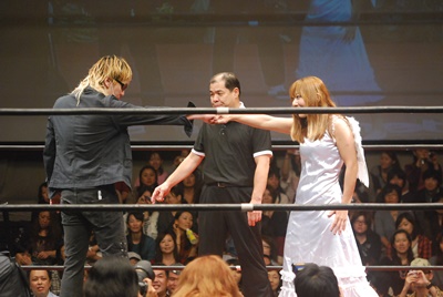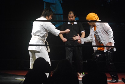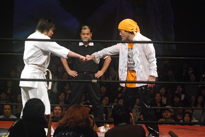 高梨がチョキで勝ち(左写真)、11/6大阪府立体育会館第二競技場大会のメインでKUDOに挑戦することに。