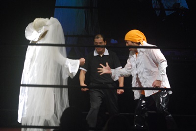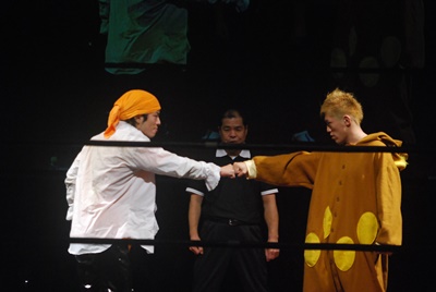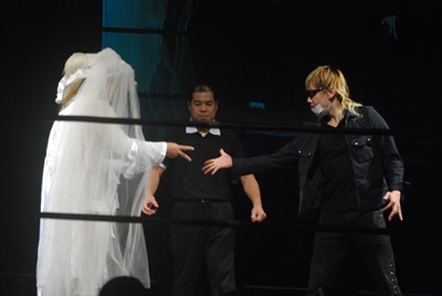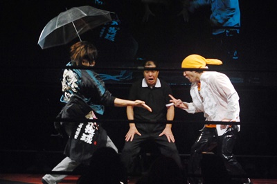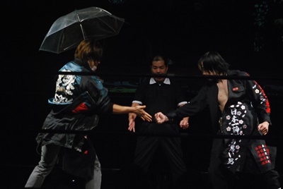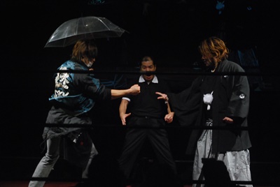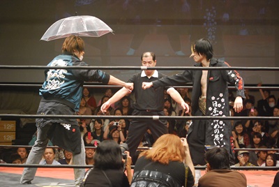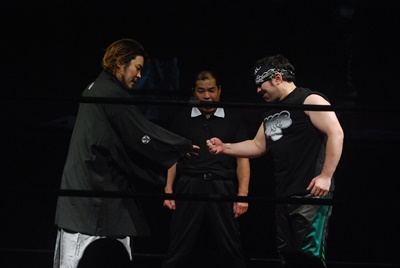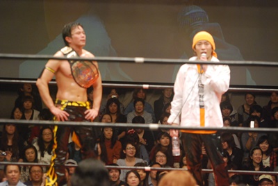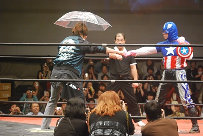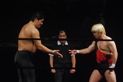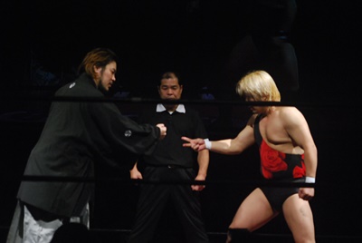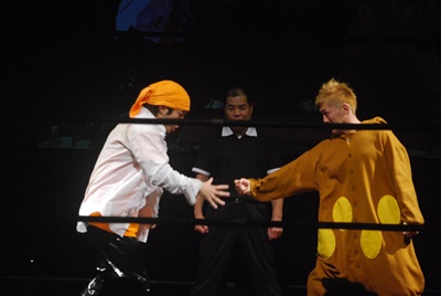 アントンのコスチュームを着けたウラノとロングタイツの石川(左写真)。先ほどのシングルマッチの再戦が早くも実現。
