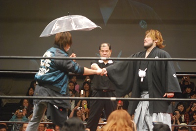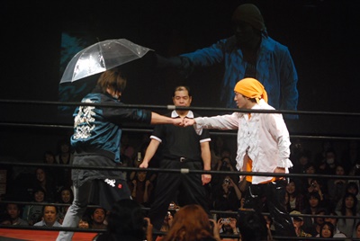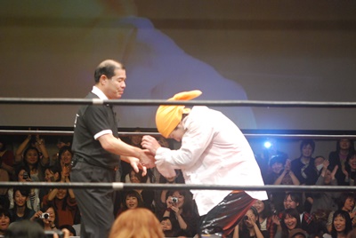 一回戦最後の組み合わせ。飯伏がニラの格好で入場(左写真)。似合うというかなんというか・・・。